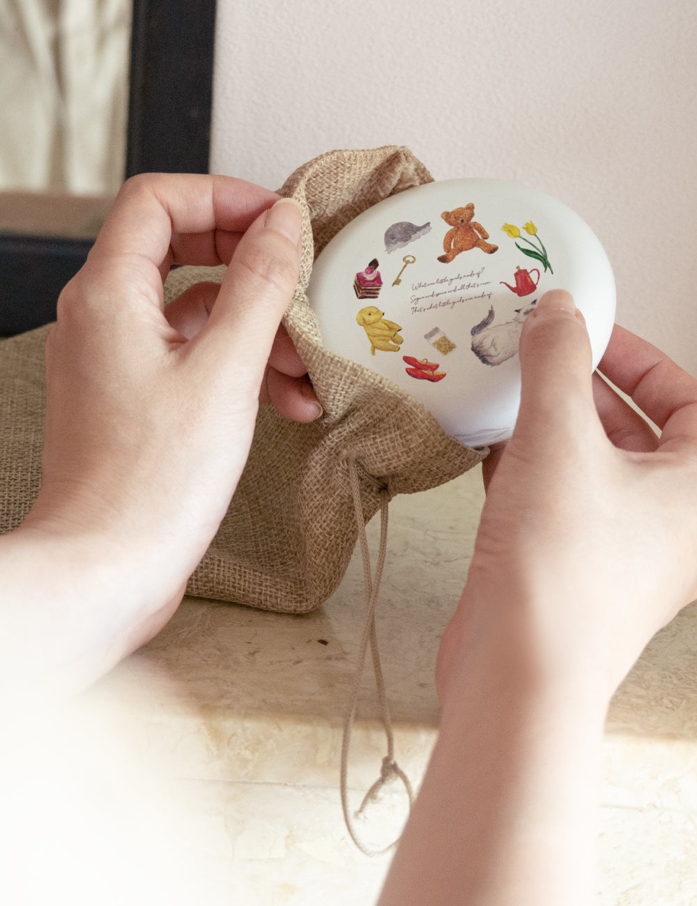 直径8cm 薄さ2cmのコンパクトなサイズ感。ポーチやカバンにすっと収まり、どこへでも一緒に。
